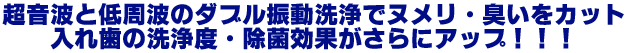 | 超音波と低周波は、歯と歯垢のつながりを弱め、歯垢を取り除くとともに、バクテリアに直接働きかけ、頑固なバクテリア連鎖や不溶性グルカンを再生不能の状態まで破壊してスッキリ清潔な入れ歯にします。 |