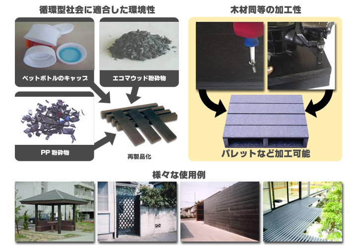 | ●パレット部材・・・ | 木製パレット同様に切断、釘打ち加工ができます。衛生的で、屋外で使用しても腐食することなく長持ちします。 |
