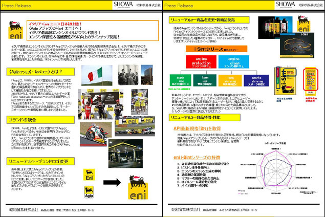 わが社が取り扱うイタリア最高級エンジンオイルブランド「Agip(アジップ)」は、イタリア最大手のエネルギー企業、 eni (エニ)社のブランド統合を受けて、2011年4月より、国内の 「Agip」ブランドを「eni」に順次統一します。
