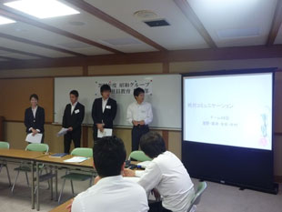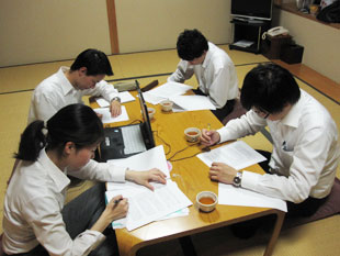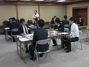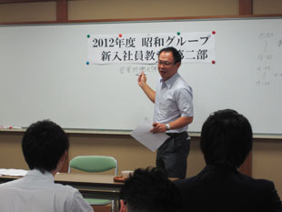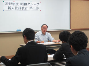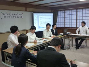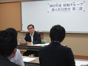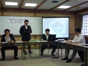 2012年7月5日(木)〜6日(金)、2012年度昭和グループの新入社員教育第二部を勝尾寺にて開催致しました。今回は、OB講師として芝崎昌治氏をお迎えし、仕事への心構えを、また阿知原取締役からは社会人としての心構え、プロとは何かをご指導頂きました。その他は昨年同様「営業折衝力強化のロールプレイング」と「ケーススタディによるグループワーク」を行い新入社員のブラッシュアップを図りました。
